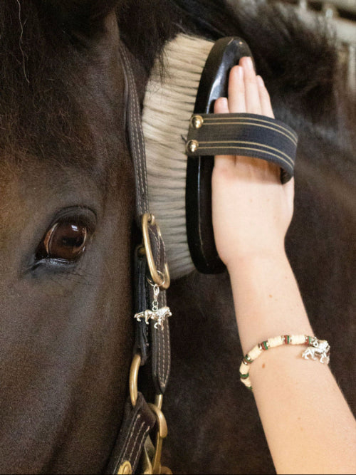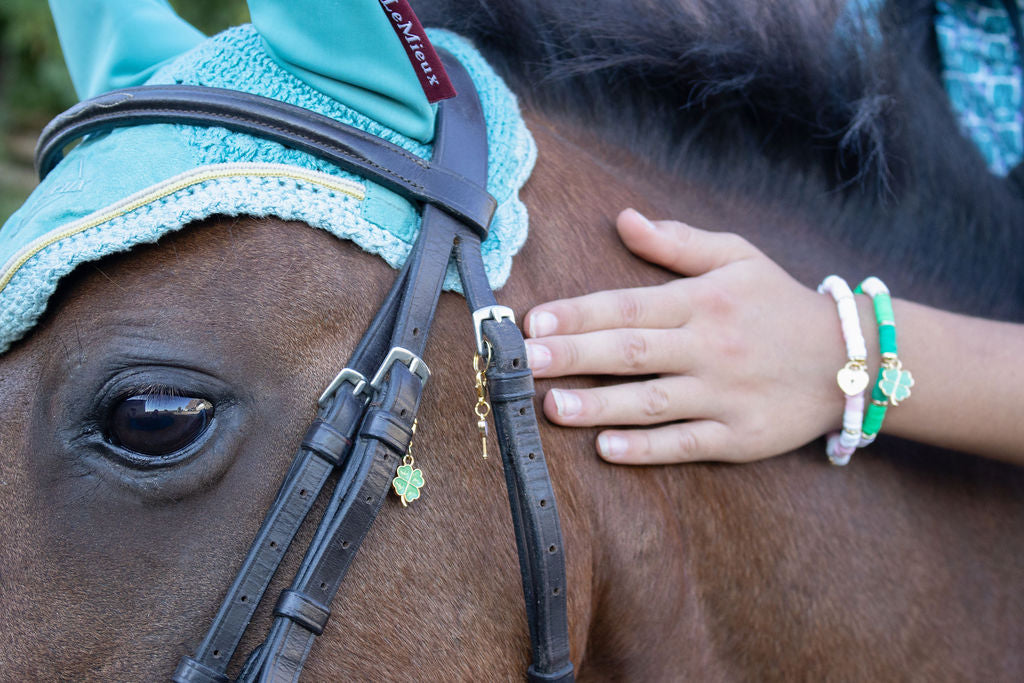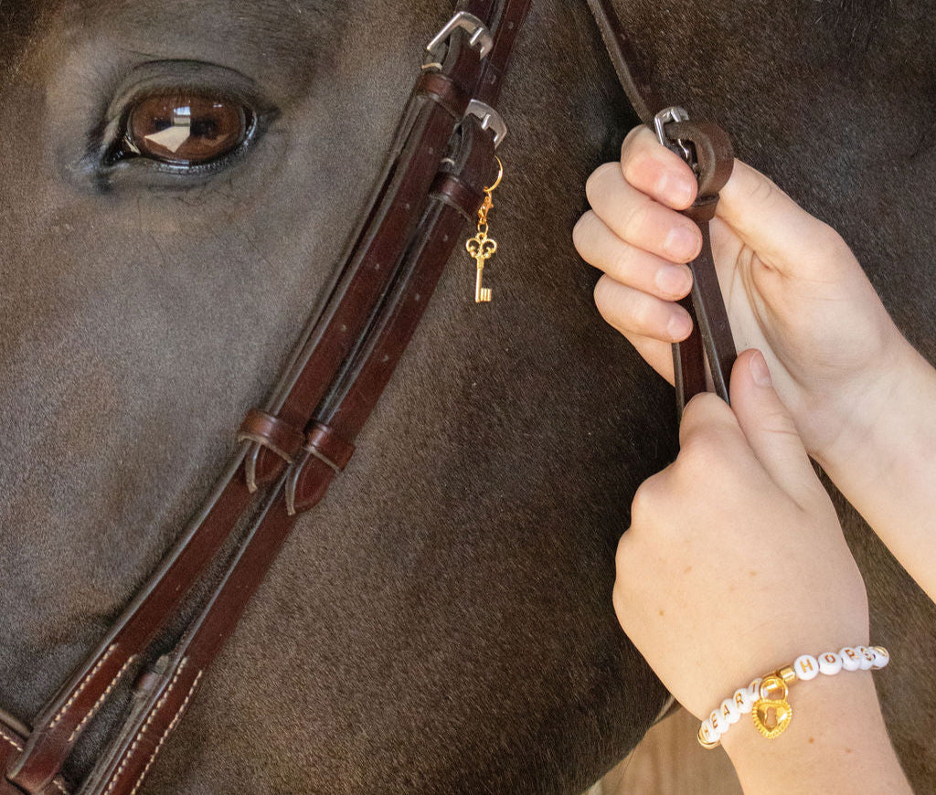 The Barn Bestie Forever bracelet and charm set includes a handmade charm bracelet for you and a matching charm for your horse’s bridle, halter, or other tack.